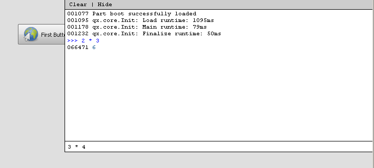 qx.log.appender.Native uses the native logging capabilities of your client if available, e.g. Firebug in Firefox (use F12 to toggle). If your browser doesn't come with developer-friendly logging, qx.log.appender.Console provides such a feature for all browsers: the console prints out the log messages in an area inside your browser window. It also includes an interactive JavaScript shell (use F7 to toggle):